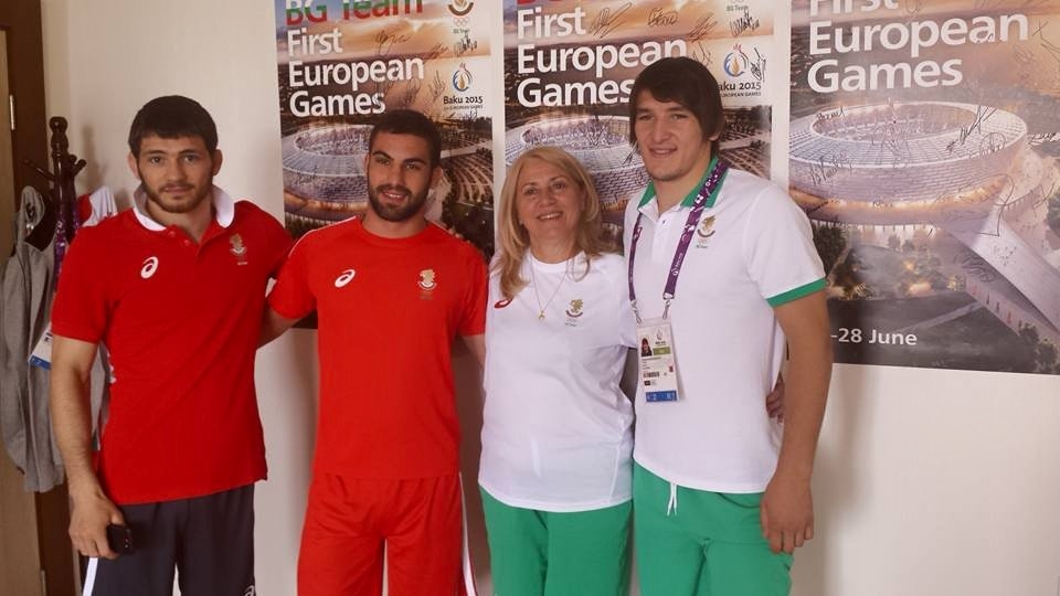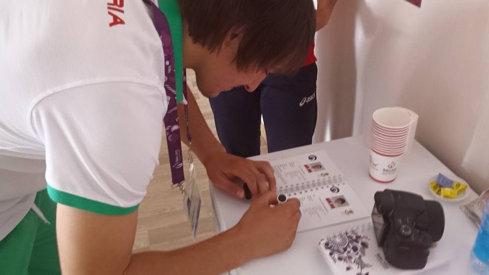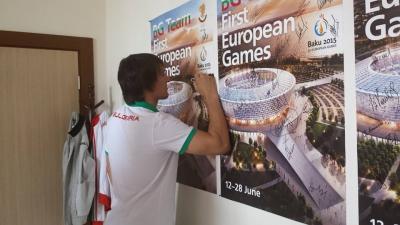 Всички български спортисти на Европейскте игри в Баку се разписват на три огромни плаката, залепени на стените в офиса на делегацита ни.